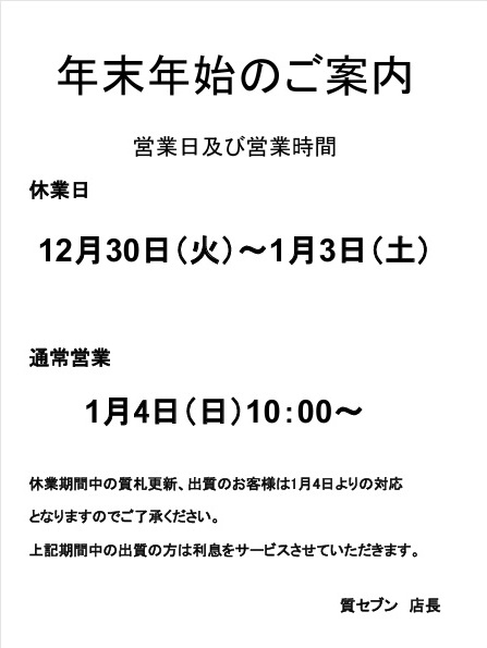 1ヶ月分3500円の質預かり料の支払いで1か月間の延長が可能。(延長は何度でも可能。)